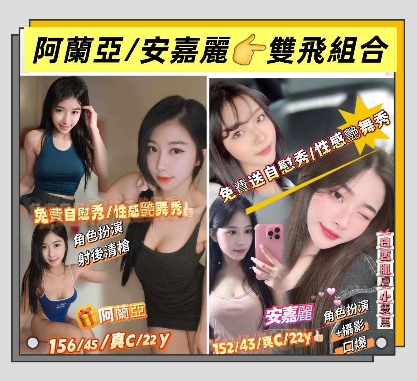 甜蜜共浴/殘廢澡/無套吹/戴套做/小親/舌吻(視衛生)/品鮑/69/冰火/按摩/奶炮/乳交/足交/舔蛋舔睪丸/胸推/水中蕭.……